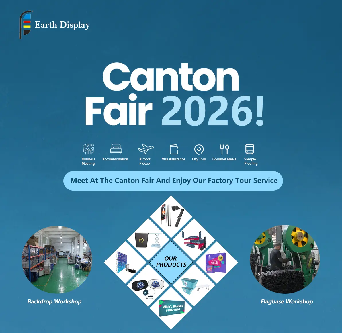 Artėja 2026 m. Kantono mugė, o mes, „Earth Display“, tikrai tikimės jus ten pamatyti. Jau daugiau nei dešimt metų gaminame plunksnų vėliavas, iššokančius fonus, vėliavų pagrindus, individualius vinilo reklamjuostes – iš esmės bet ką, skirtą parodoms ir reklamoms. Šį kartą, užuot kalbėję internete, norime parodyti, ką darome akis į akį.